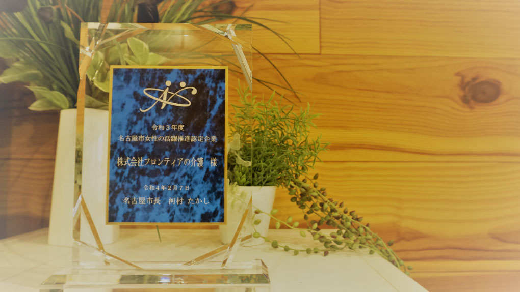 フロンティアの介護は「名古屋市女性の活躍推進認定企業」です。 「働く女性が個性と能力を十分に発揮できる社会」の実現を目的として、フロンティアの介護は働きやすい環境の整備に積極的に取り組んでおります。